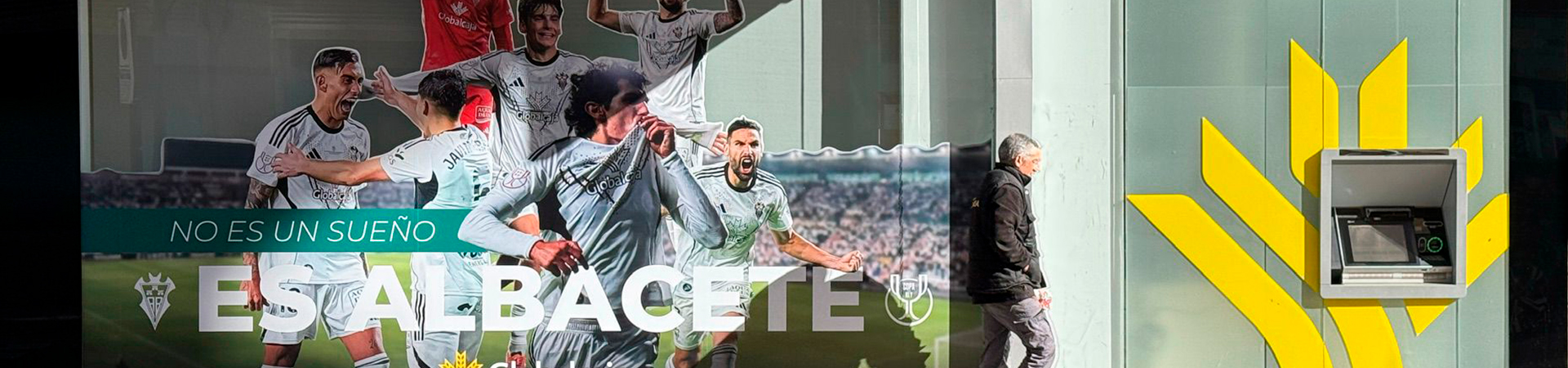 La entidad ha vestido los escaparates de sus principales oficinas en la ciudad con la imagen de algunos de los jugadores del Alba y el mensaje ‘No es un sueño, es Albacete’, con el triple objetivo de poner en valor lo que hicieron frente al Real Madrid, reforzar el orgullo de pertenencia y mantener viva la ilusión de la ciudadanía.